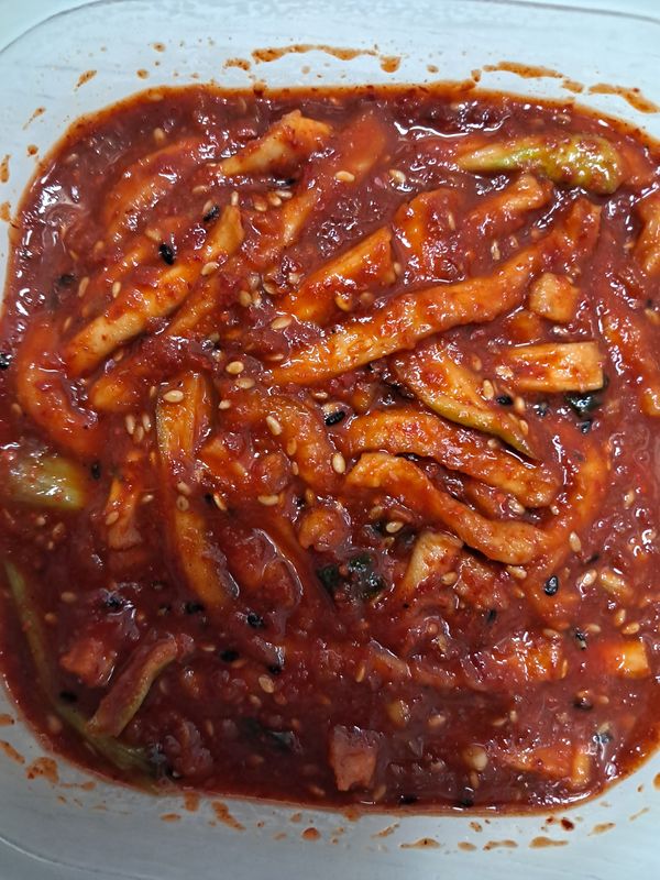 사실 그동안 구매한 제품들 중 무가 넘 매워서 구매할때마다 후회하는 제품이었는데 후기가 좋아 주문하게 되었습미다. 살짝 맛보았는데 다행이 무가 맵지 않아서 좋았습니다. 참기름과 깨소금 곁들였더니 더 맛있네요