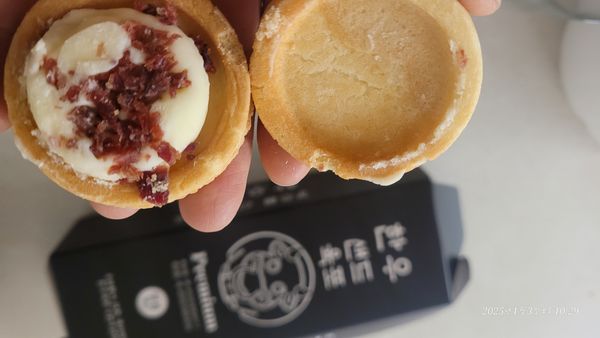 부드러운쿠키에 버터링식감이에요 한우육포가 콕콕박힌 고급디저트에요 육포맛은 거의안나는데 맛있어요 한우라 비싸서그런지 양이 너무적어아쉽네요