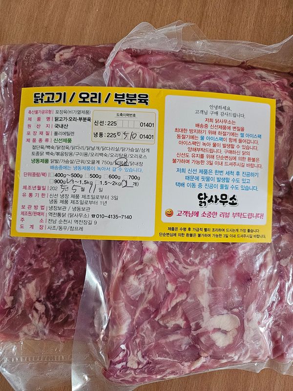 배송이너우잘되서왔네요.아이스팩을 앞뒤로넣어주셨어요.닭갈비처럼해봤는데 달밝처럼쫄깃하고 맛있네요.다만 뻐가 좀 십히기도해요.발골하실때 세심히 신경써주세요.재구매할꺼예요