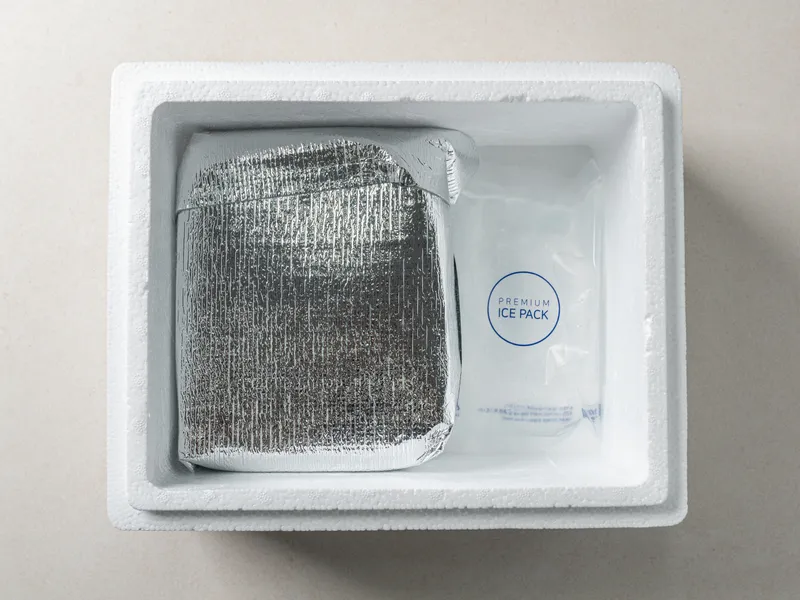 아이스박스에 완충재를 넣어 배송해 드립니다. 얼린 생수를 동봉해 드리며 생수는 음용하셔도 됩니다.