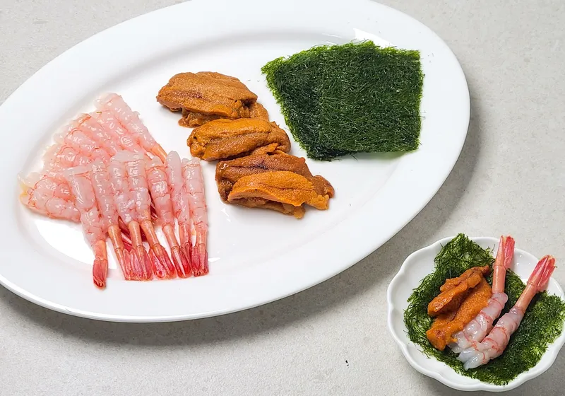 성게알과 단새우를 신선하게 준비했어요. 풍미 가득한 성게알과 단새우를 감태로 싸서 먹으면 바다의 순수한 향과 맛을 그대로 느낄 수 있습니다. 입안에서 사르르 녹는 부드러움과 쫄깃한 식감, 그리고 은은한 단맛의 조화가 일품이에요.