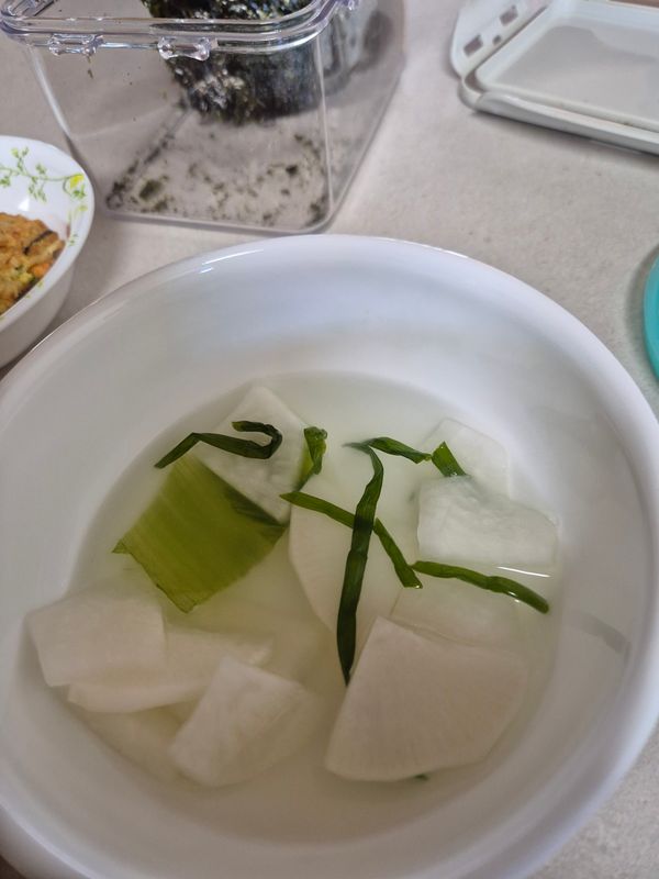 무우가 진짜 맛있네요^^ 익혀서 먹으라고 했는데 못참고 큰무우 하나 썰어서 맛있게 먹었어요^^ 시원하고 아삭해서 항암중인 남편이 입맛을 찾았어요^^ 5키로 많다 생각했는데 무우 하나 건져내니 금방 동나겠어요^^