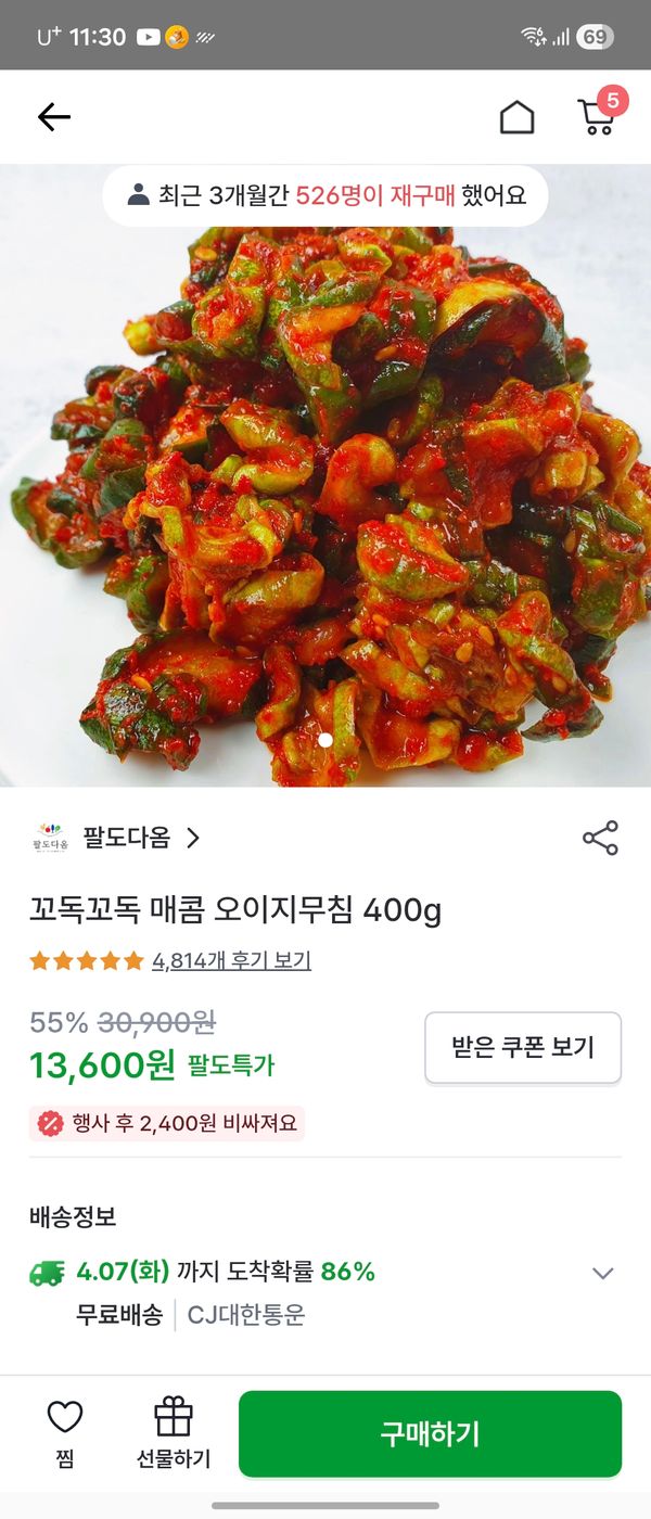 기존에 먹던 오이지랑은 차원이 틀리네요 오히려 더 신선한맛과 아삭거림이 너무 맛있네요 딸 주려고 두개 주문했는데 딸도 좋아할것 같아요 다 먹고 재구매 하겠습니다