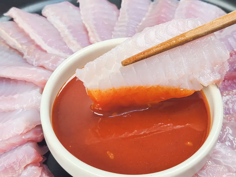 참홍어는 초장에 찍어 상큼하게, 소금과 참기름 기름장에 찍어 고소하게 즐길 수 있습니다. 잘 익은 김치와 돼지고기 수육을 곁들인 삼합으로 먹으면 감칠맛과 풍미가 극대화됩니다.