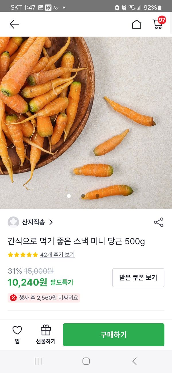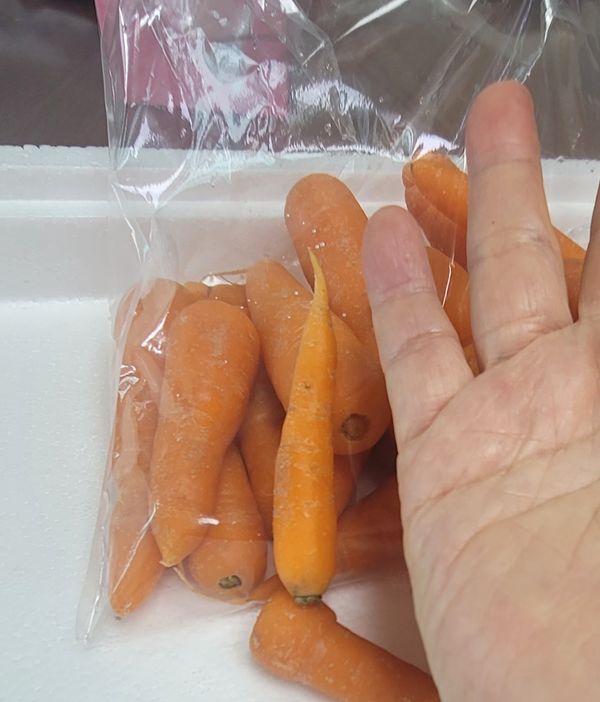 엄청 작은 당근이예요.매일 당근 챙겨먹는데.간편할거같아요.맛은그냥먹을만해요.아주달진않아요.강아지랑 같이 먹으려구여