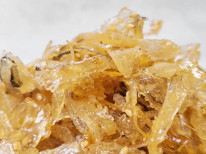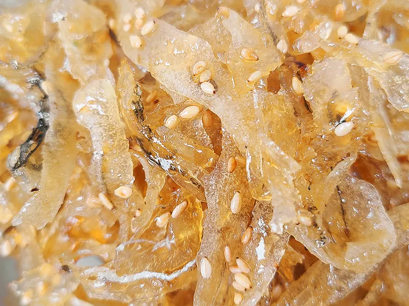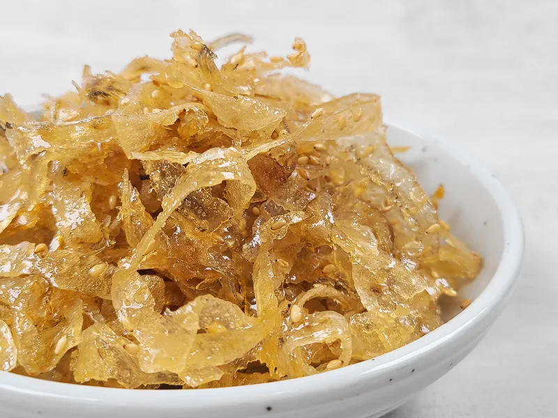 달콤 짭조름한 맛의 명엽채! 뚜껑을 열자마자 고소한 참기름 냄새가 풍겨요. 쥐포보다 연한 식감으로 딱딱하거나 질기지 않아 이가 좋지 않으신 분들도 드시기 좋답니다.