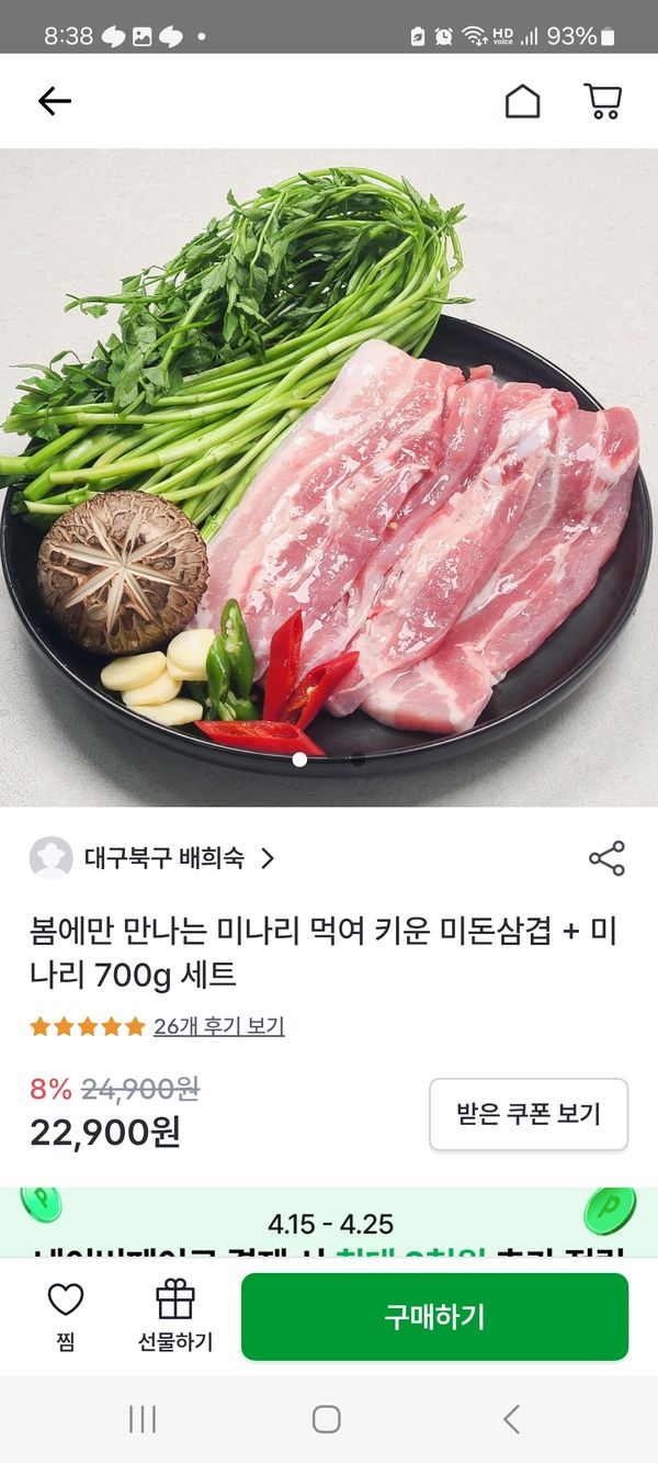 시중에 일반 삼겹보다 맛이 달라요. 건강한 맛이라고 할까요. 두께가 조금 얇고 부담없어요. 미나리는 겉절이 반.구울때 일부 구워서 한입가득~~^^