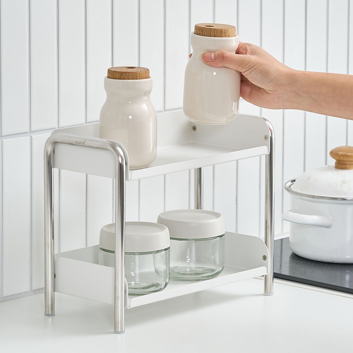 무디타 비화이트 2단 철제 정리 선반 / 홈카페 영양제 양념통 틈새 정리함