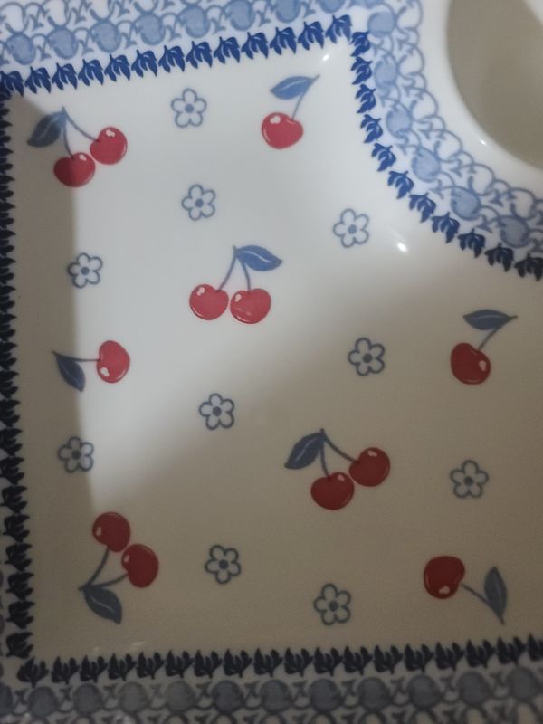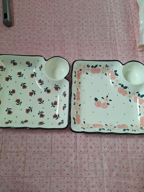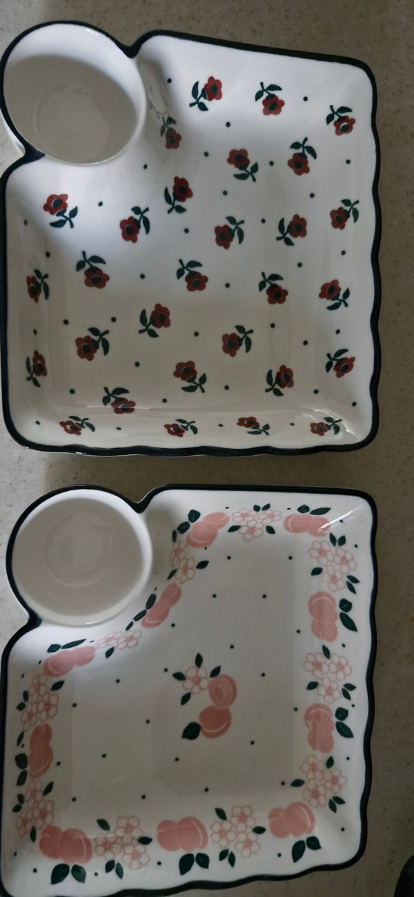 음식과 소스종류를 같이 차려놓을수 있어 실용적이고 예쁜접시 두개가 만원 초반대ㅡ저렴해서 좋아요~^^ 좀 무겁지만 그만큼 튼튼해서 잘 깨지지않길 바랄뿐...