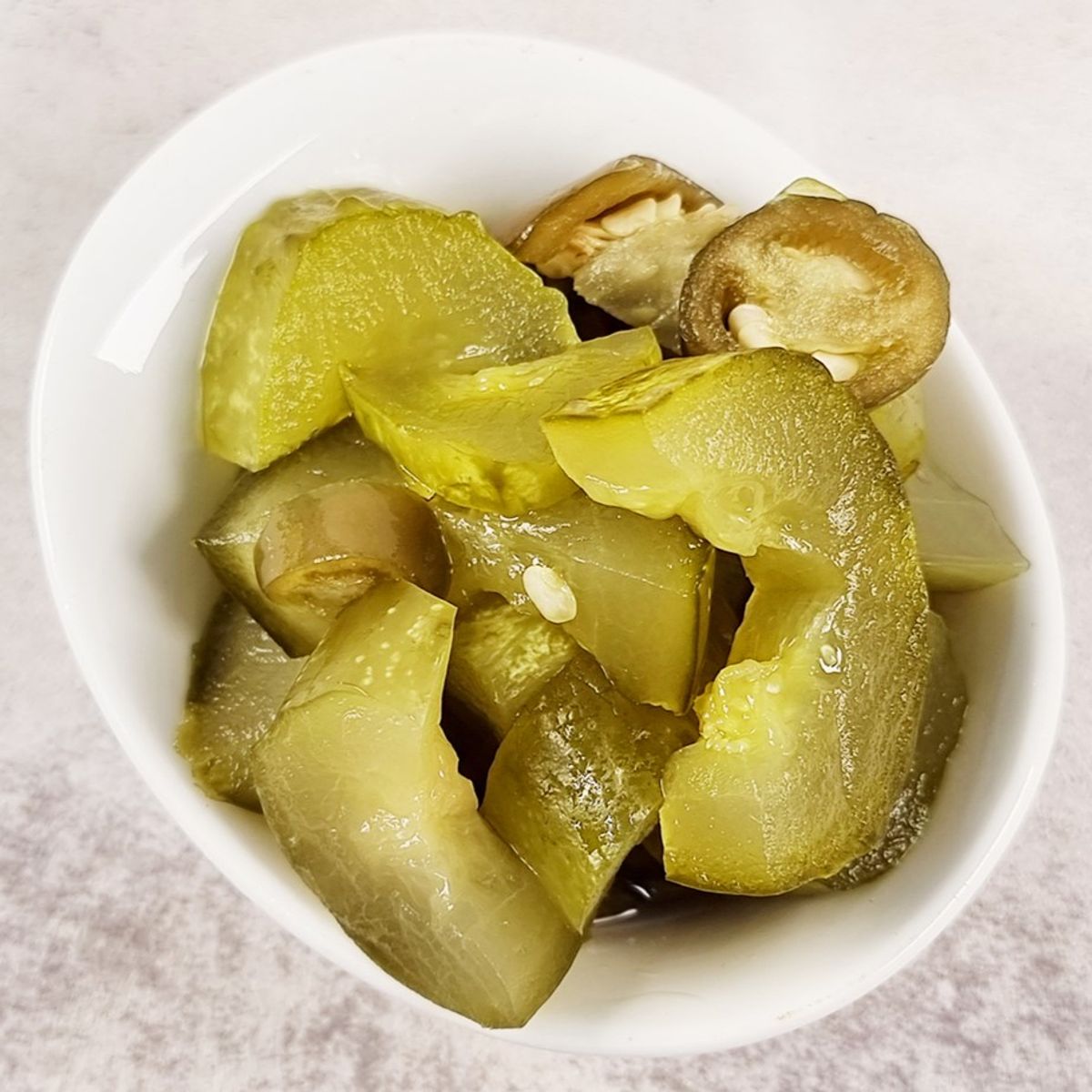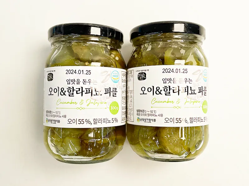 싱싱한 오이와 할라피뇨를 도톰하게 썰어내 아삭한 식감이 일품인 오이 할라피뇨 피클입니다. 새콤 매콤한 맛이 필요한 어느 순간이든 어떤 음식과도 최고의 궁합을 자랑한답니다😋