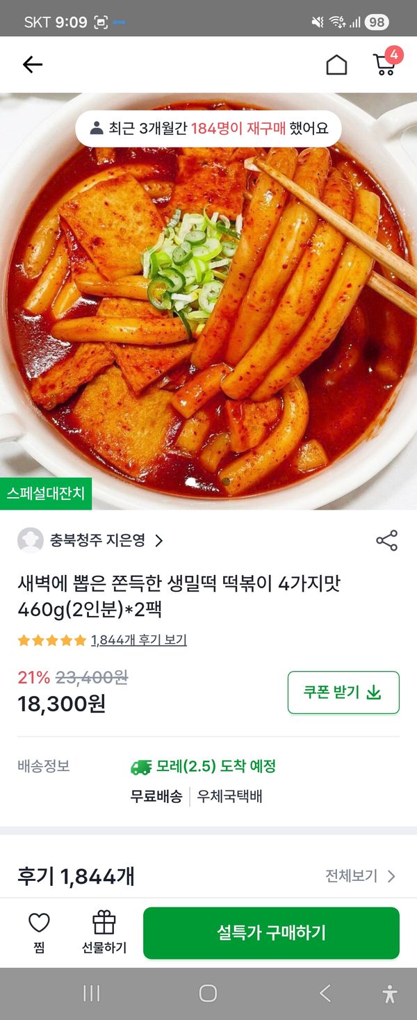 매운걸 잘못먹어서 순한맛 먹다가 맵기가 보통맛은 괜찮을것같아 주문했어요~ 떡이 쫀득 쫀득 식감도 좋고 맛있어요!!