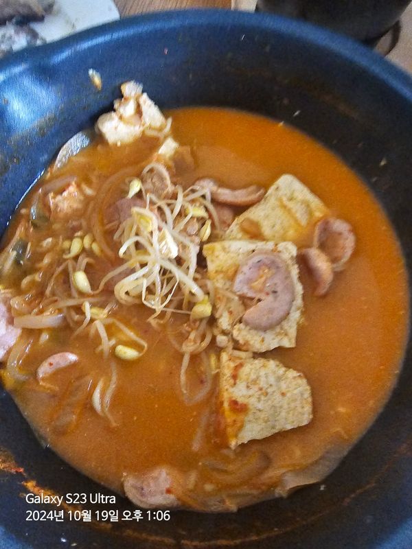 두부랑 콩나물 넣고 끓였어요. 국물이 순하네요. 넉넉한 2인분입니다. 개인적으로 부대찌개에 콩? 들어가는걸 좋아하는데 포함되어 있어 좋았어요.