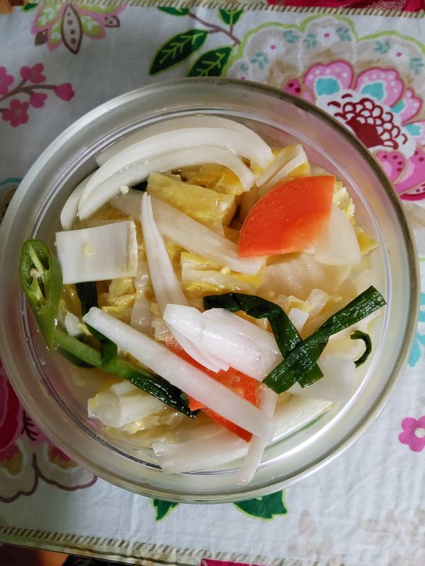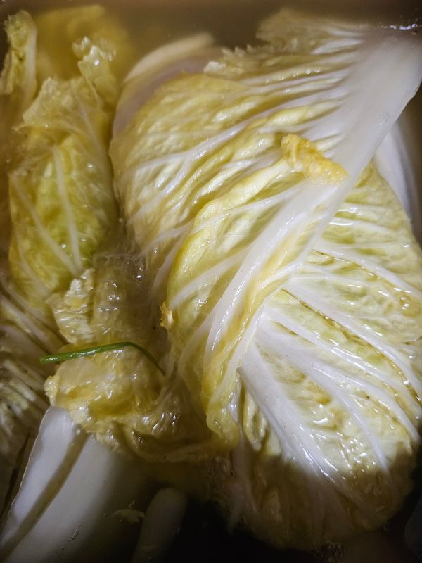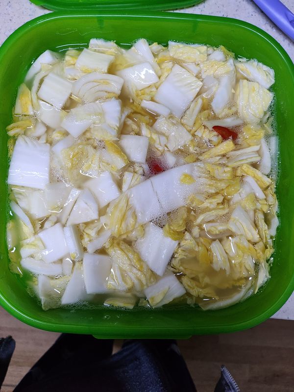 싱겁게 맛있어요. 배추가 뻣뻣하게 덜 절여져서 추가 쪽파,당근, 간을 좀더하고 익혀서 먹으니깐 훨~맛있네요