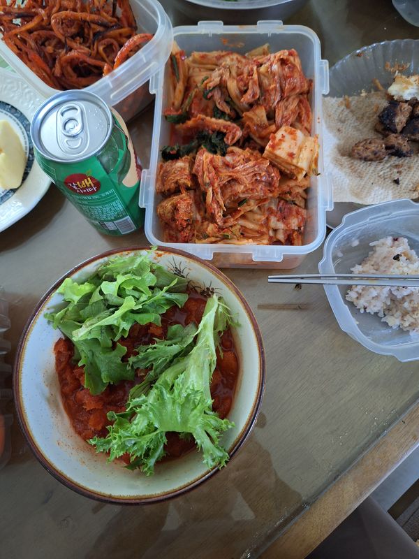 육회, 연어, 광어 따로 준비하고. 야채도 따로 손질해야되는게 번거로웠지만. 너무 맛있게 먹었어요. 회물회보다 육회물회가 최고! 육수가 맵지 않고 딱 좋았습니다. 밥도 말아 먹었어요
