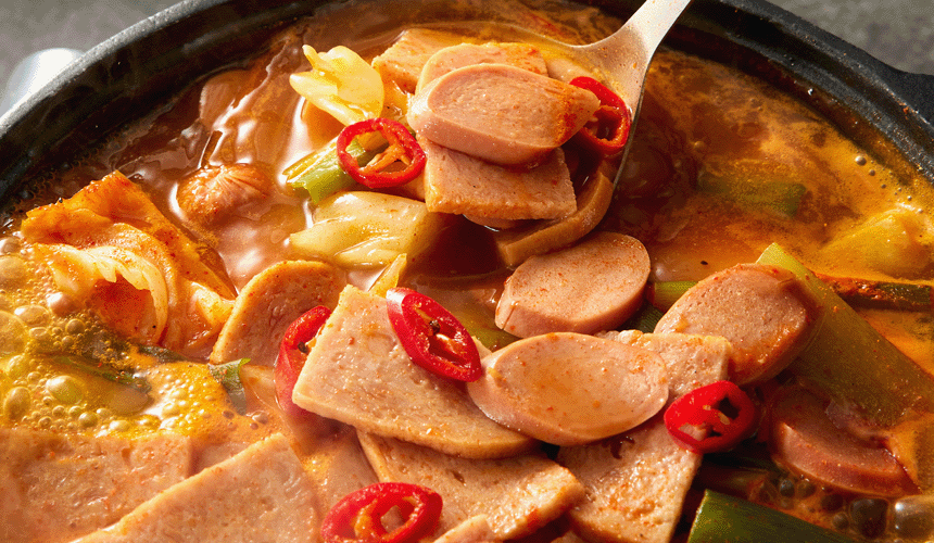 햄, 소시지, 채소가 넉넉히 들어 있어 내용물이 알찬 부대찌개예요. 국물이 칼칼해서 밥은 물론 라면사리 넣어 먹기에도 좋아요.
