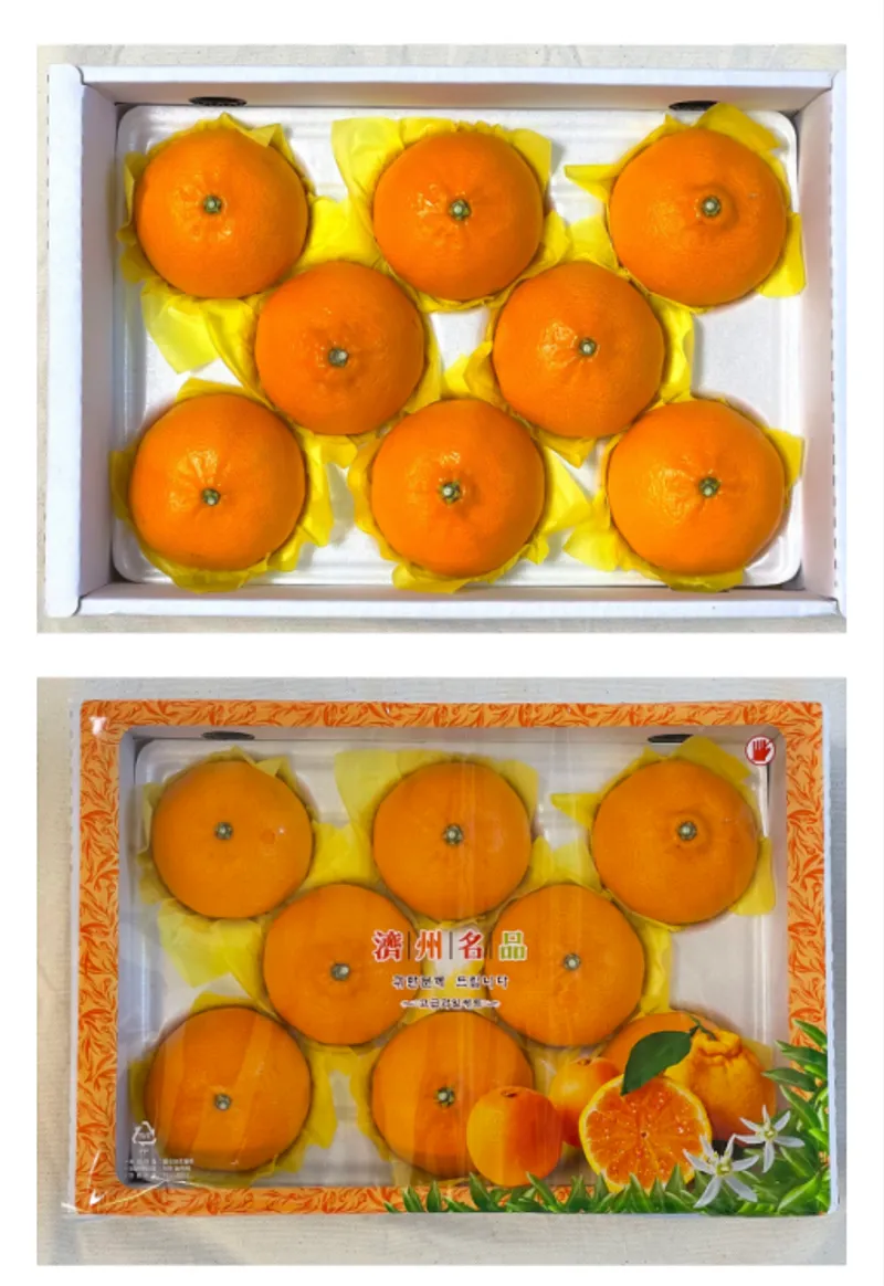 - 상자 내부: 난좌와 투명창 붙여 보호 - 상자 외부: 투명 보호비닐로 마지막 포장하여 추가 보호 - 비가 오는 날 상자가 젖는 부분과 한라봉 손상 최소화