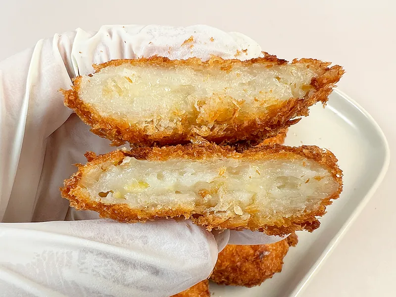 고로케 맛은 튀김옷이 결정한다고 해도 과언이 아닙니다. 신선하고 품질 좋은 생 빵가루로 튀겨내 흩날리듯 가볍고 바삭한 식감이 특징입니다. 빠삭빠삭한 식감을 제대로 느껴 보세요!