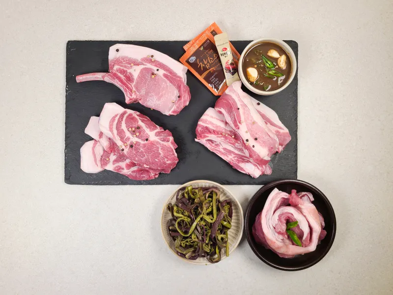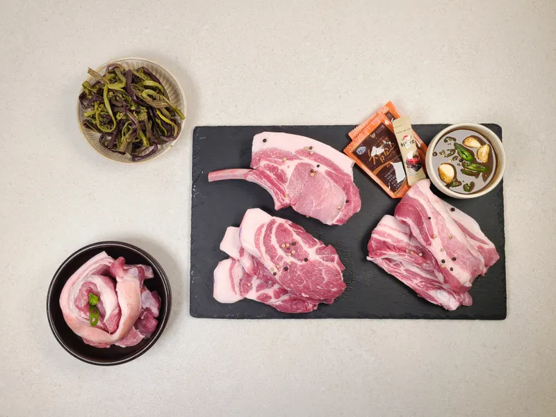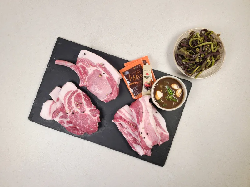 흑오겹살 300g+흑목살 300g+전지 300g+프렌치랙 1대(약 200g)+제주 고사리 200g+멜젓 40g으로 구성되어 있습니다.