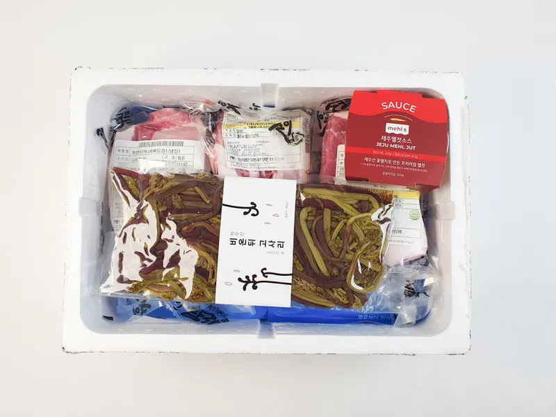 흑오겹살 300g+흑목살 300g+프렌치랙 1대(약 200g)+제주 고사리 200g+멜젓 40g으로 구성되어 있습니다.
