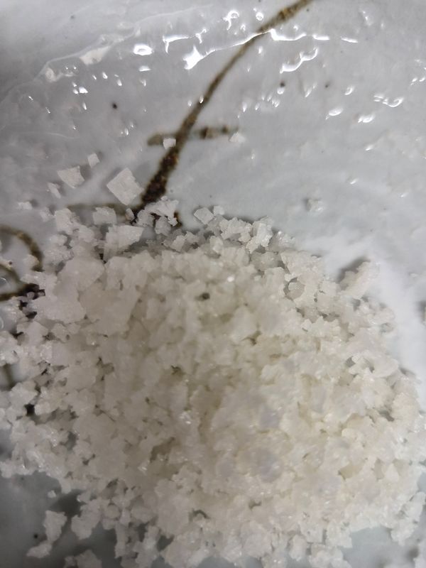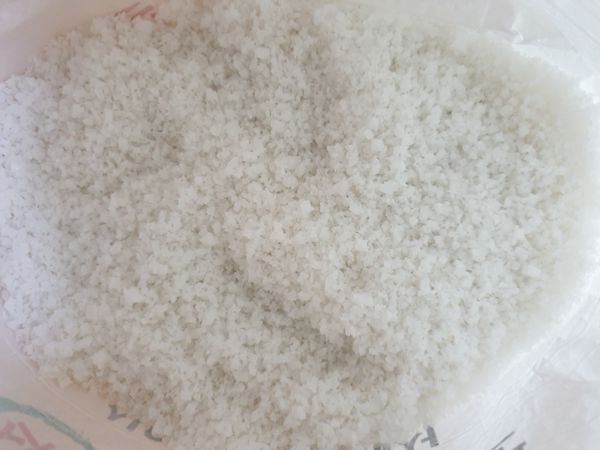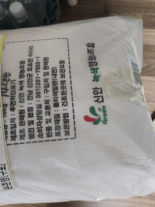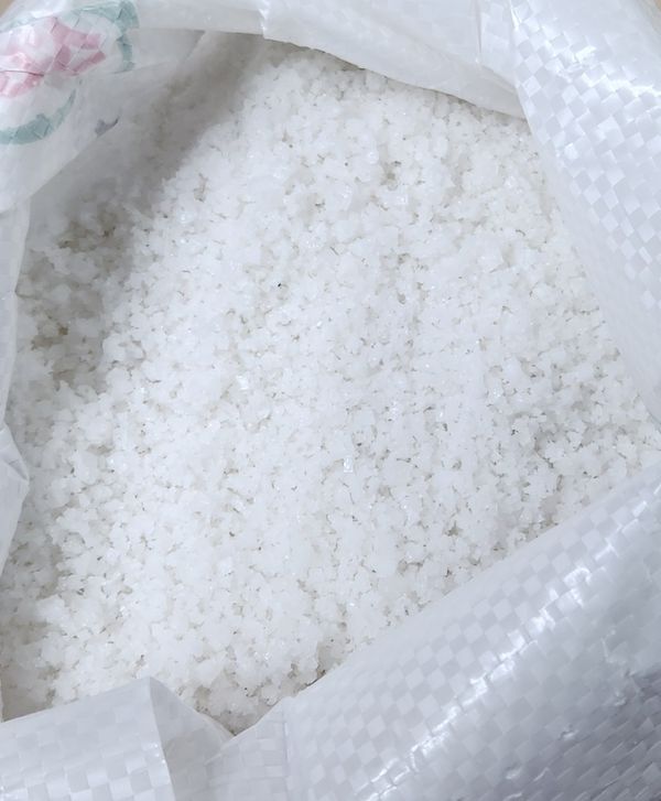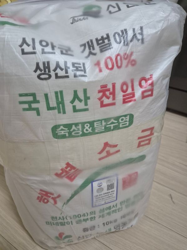 14년도 생산이라 간수 충분히 빠져서 쓴맛 없구요 끝맛은 살짝 단맛 있어요. 근데 거뭇한 티? 불순물이 약간 보이네요. 상관 없지만요. 토판염인 회백색의 게랑드소금보다 색은 탁하지 않네요. 포장상태는 마대에 비닐로 이중포장 되어서 왔어요. 소금이력제 마크도 보이네요.