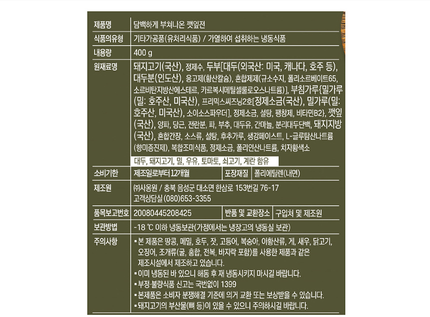[마녀바스켓] 명절에 빠질 수 없는 사옹원 부침명장 깻잎전400g x2팩*