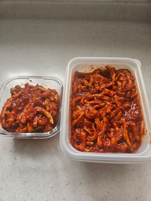 후기가 좋아서 주문했는데 제 입맛은 마트에 파는 종가집 무말랭이에 길들여져서인지 단맛이 살짝 덜한것 같아서 꿀을 살짝 넣어서 버무렸더니 괜찮네요.