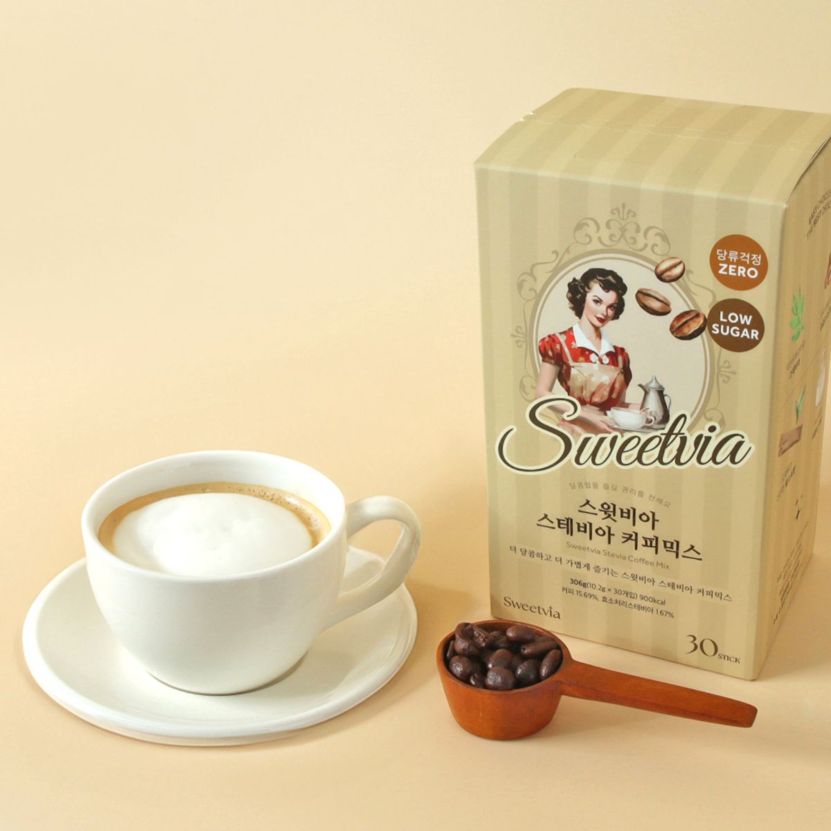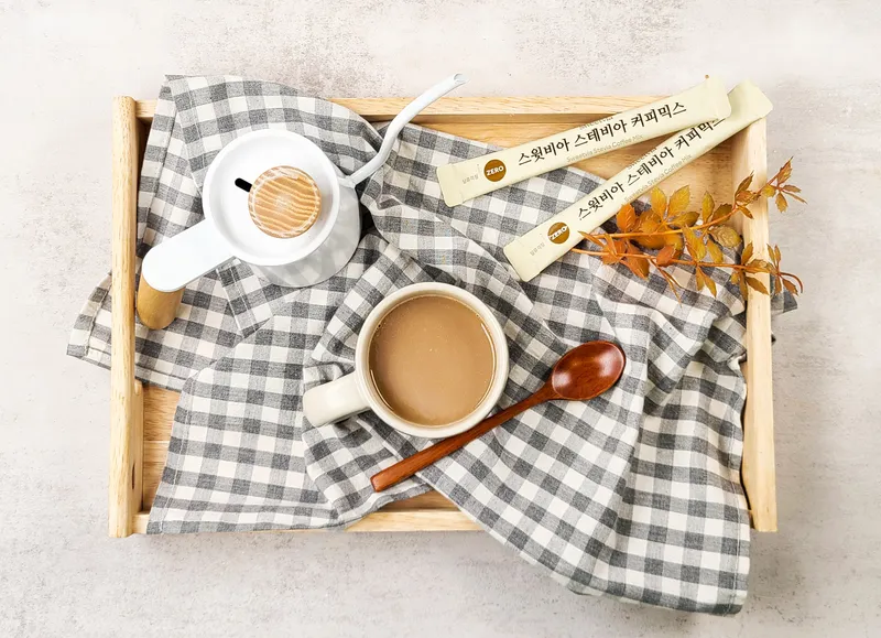건강 때문에 달콤한 커피 말고 취향에 안 맞는 쓴 아메리카노만 드시진 않으셨나요? 저희 커피믹스는 설탕이 아닌 자연유래감미료 스테비아를 사용해 스틱 한 포에 당 함량이 0g이기에 부담 없이 즐길 수 있답니다.