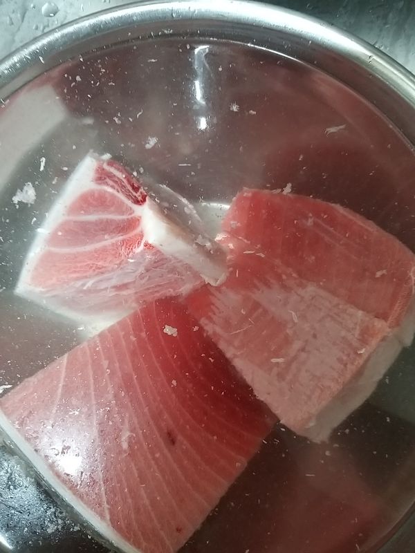 뱃살에 피가 촘촘히 박혀있어 썰면서 마음이 안좋았는데 다행히 비리내는 안났어요. 제품 확인하고 보내주세요 사진은 뱃살 속살 구분안되게 받은 지난번 사진입니다