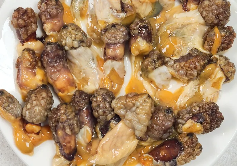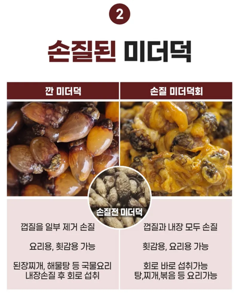 울퉁불퉁한 모양이지만 나른한 봄철 입맛을 깨워주는 바다 내음 가득한 미더덕이에요. 오독오독 재미있는 식감과 함께 바다 내음이 살아있는 풍미를 느낄 수 있어요.
