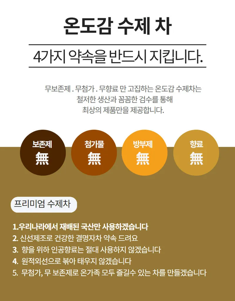 미세플라스틱, 벤조피렌 걱정 없이 드실 수 있는 건강한 원물 차입니다. 원물의 고소함이 잘 우러나올 수 있게, 최고급 국산 원재료로 각각의 맛을 살리는 온도와 방식으로 볶아냈답니다 :)