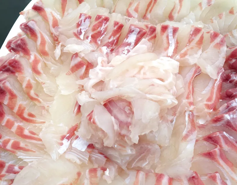 부드러운 식감에 담백하고 고소한 맛을 자랑하는 고급 흰 살 생선 참돔회입니다. 지방이 적고 단백질이 풍부해요.