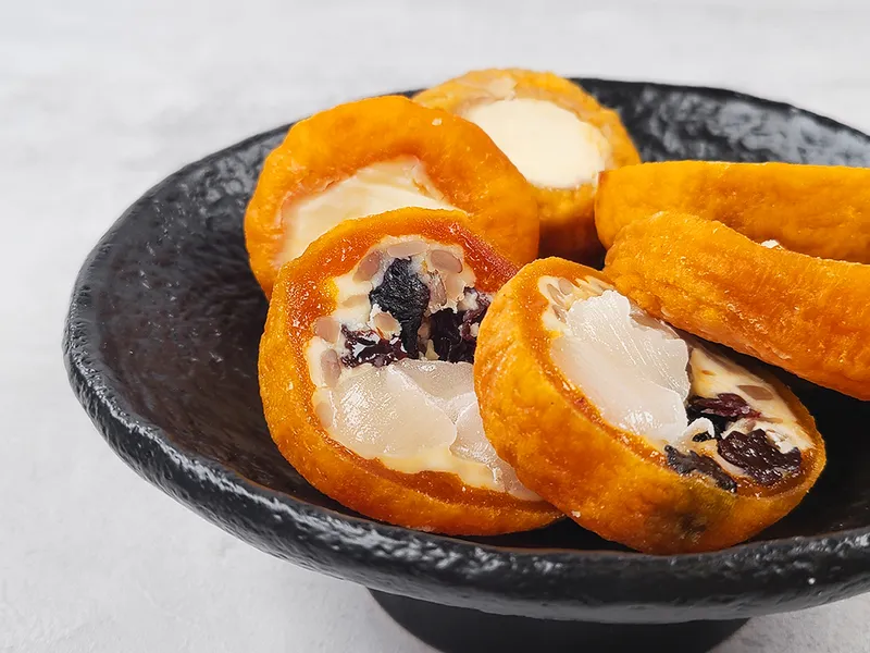 전통 곶감에 크림치즈를 듬뿍 올렸습니다. 젤리처럼 쫀득하고 촉촉한 곶감에 부드러운 치즈가 흘러나와요.