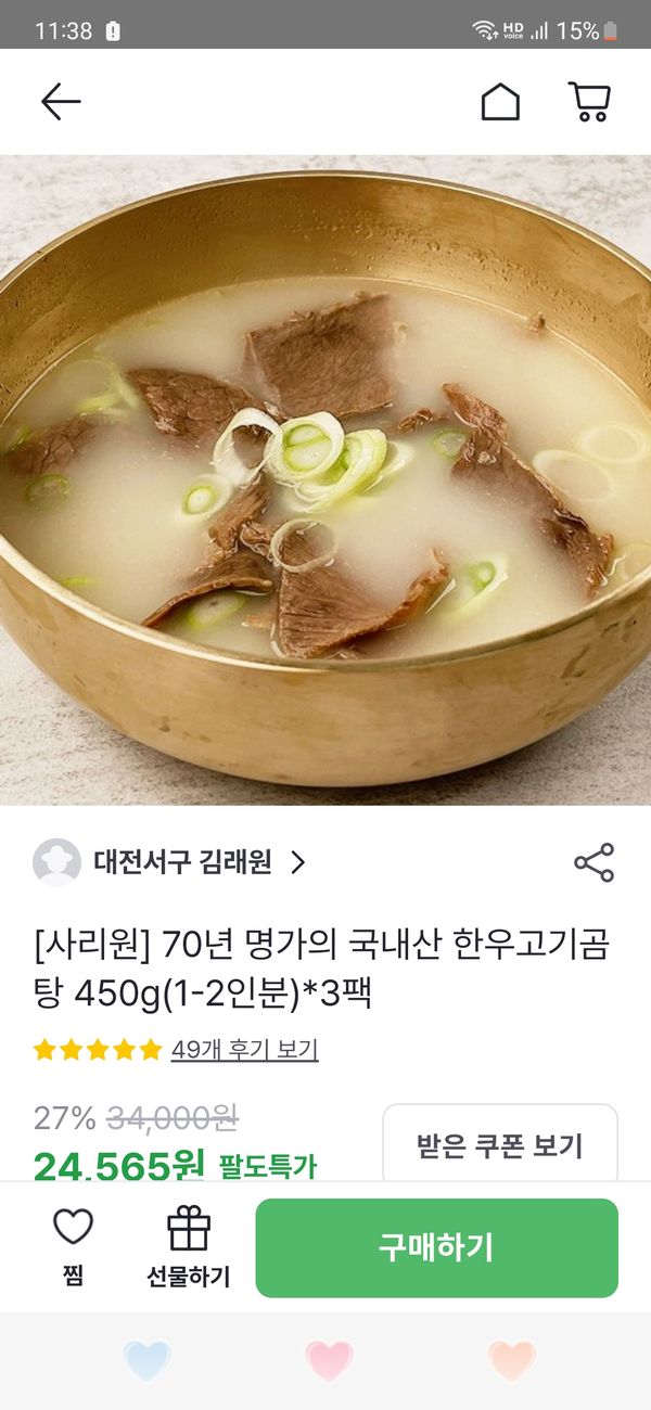 옵션: 한우고기곰탕 450g(1-2인분)*5팩