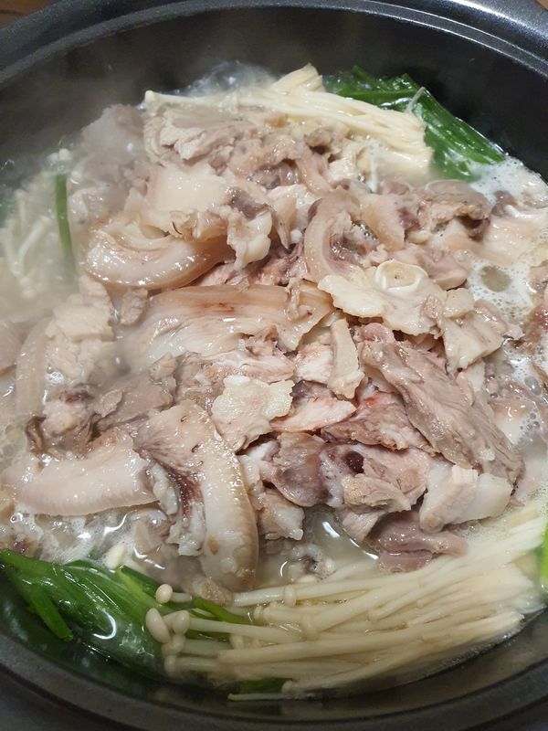부추랑 팽이버섯 깔고 그위에 머릿고기 얹어서 수육해서 겨자간장소스 만들어 찍어먹었어요 돼지냄새 1도 안나고 진짜 부드럽고 맛있어요