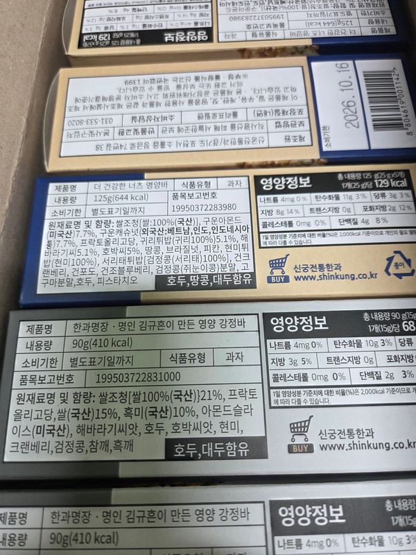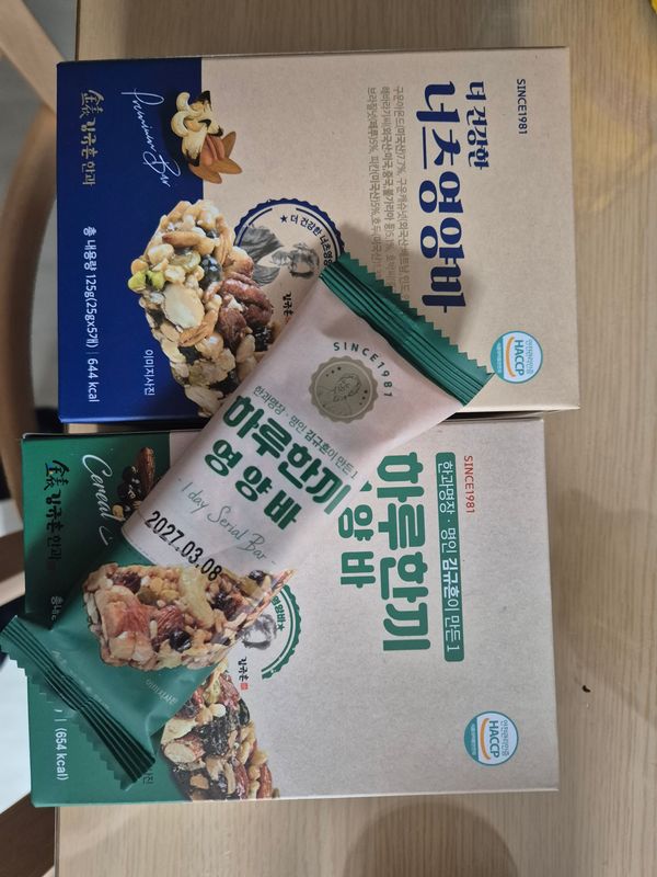 명절 선물로 친정에 보내드렸는데 견과류가 강정처럼 바 형태로 되어있으니 먹기도 편하고, 많이 달지않고, 딱딱하지 않아서 좋다고 하시네요. 강정바는 뻥튀기 곡물 위주라 좀 더 부드럽고, 너츠바는 견과류 위주라 견과류 챙겨 드시는 분들에게 좋을 것 같아요.