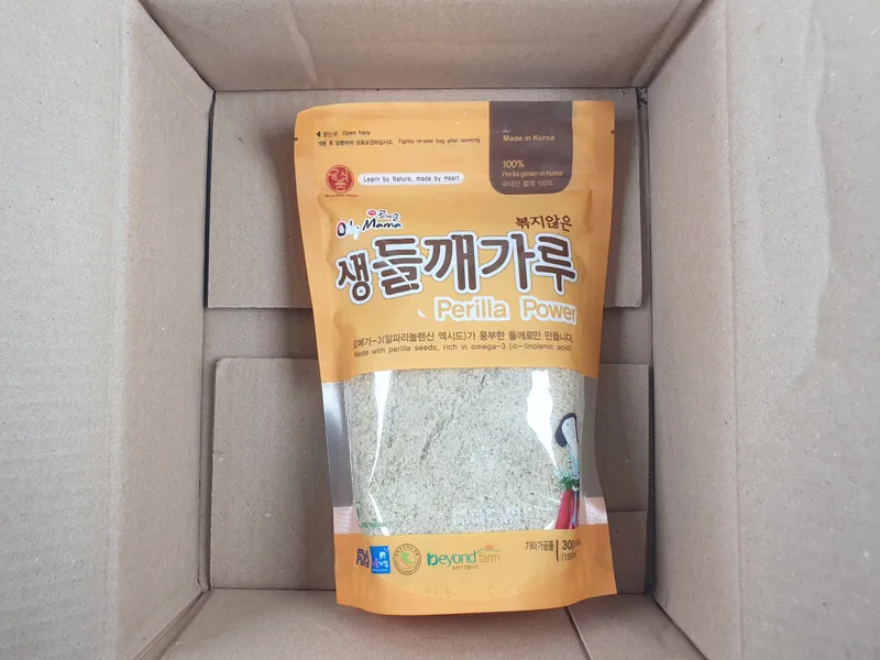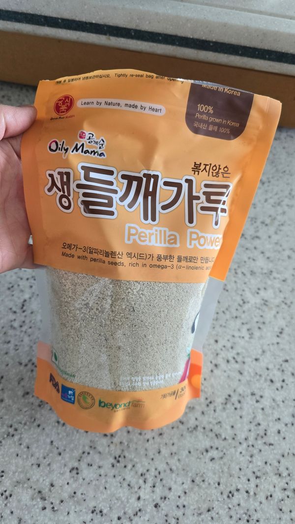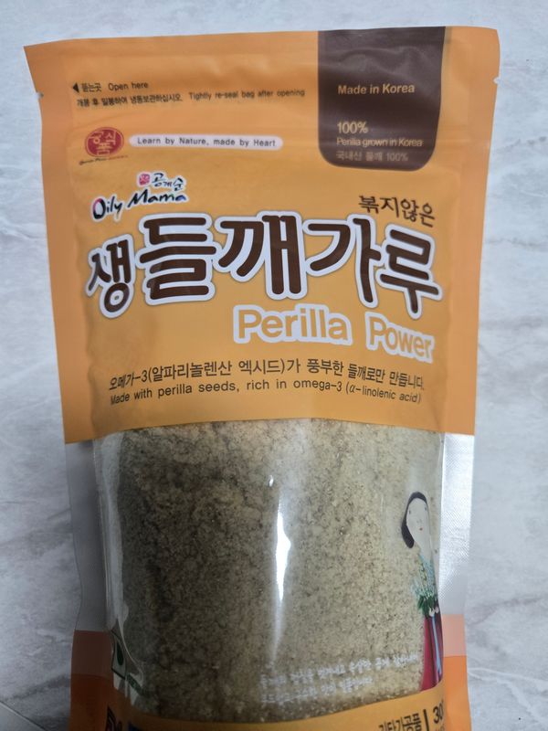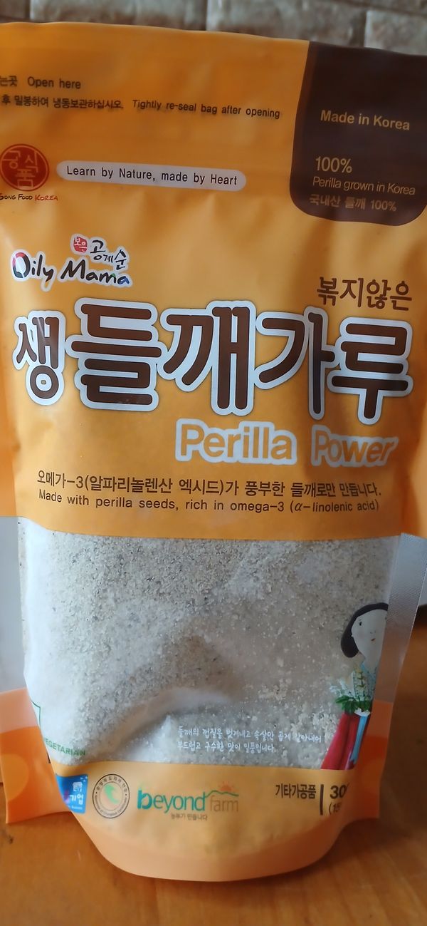 쌀가루 등을 일체 혼합하지 않았으며, 오직 들깨만을 사용해 깨끗하게 껍질을 벗기고 속알맹이만 곱게 갈아 만든 들깨 100%의 순수한 들깨가루 입니다.