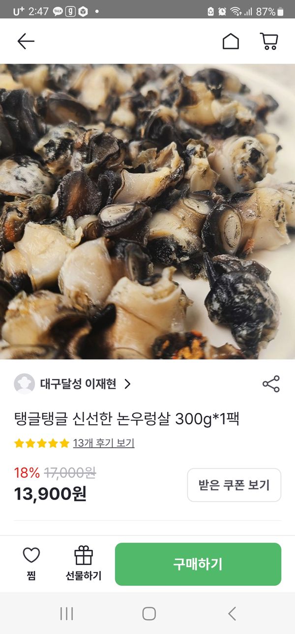 탱글탱글 쫄깃한 식감을 자랑하는 논우렁살입니다. 살이 오동통하게 차올랐죠. 싱싱함을 자랑해 비린맛 하나 없답니다.