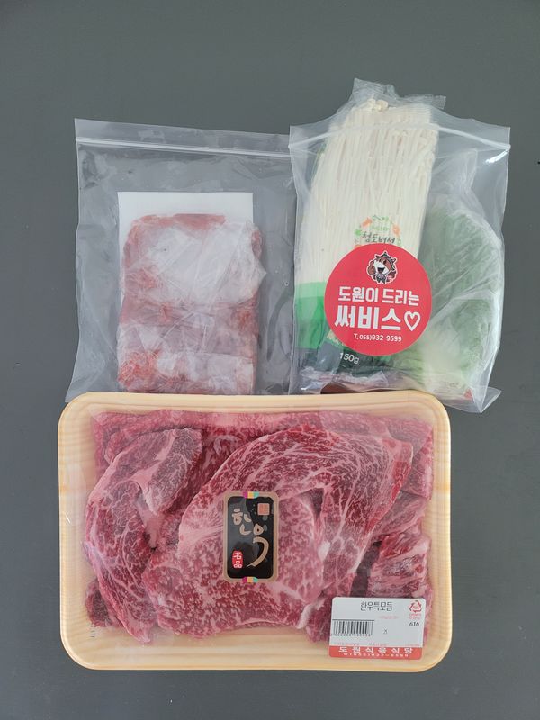 고마운 분 선물드릴 일이 있어, 1++(9) 특수부위만 주는 모둠이라길래 믿고 샀는데 맛있다 하십니다~~ 부위별로 얼마만큼씩 주셨는지 지식이 없어서 모르겠네요. 꽃등심 세 파트 중 새우살은 생긴것이 새우 모양이라 알겠고, 살치살은 빽빽한 대각선 결이나 희고 촘촘한 그물이 도드라진다고 했는데 까막눈이라 봐도 모르겠더라구요~ 부채살도 뭐가 다른지 구분을 전혀 할 줄 몰라 그냥 고기구나 하네요 ㅎㅎ 경남 합천 도원 식육식당 가게도 하시는 것 같던데 한우 1인분에 27000원으로 저렴하더군요. 인근 가면 들러봐야겠어요 ^^