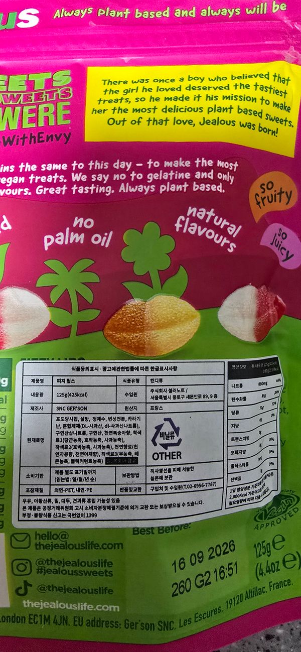 젤라틴 없는 젤리 좋아합니다. 가격이 저렴하진 않지만 용량도 작지 않고 모양도 입술모양으로 귀여워서 좋구요 맛도 상큼합니다.