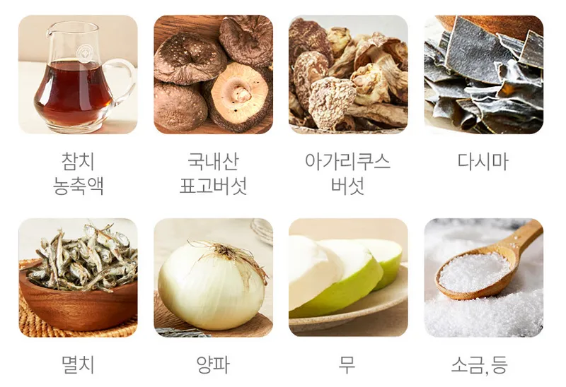 국산 다시마와 무, 양파, 멸치, 아가리쿠스 버섯, 표고버섯, 소금, 간장 등. 엄선한 최고급 원재료간의 최적의 비율을 연구하여 뛰어난 맛과 궁합을 찾았습니다. 특히 풍부한 영양소가 함유된 아가리쿠스 버섯이 들어가 타사 제품이 흉내낼 수 없는 감칠맛까지 한층 높였습니다.