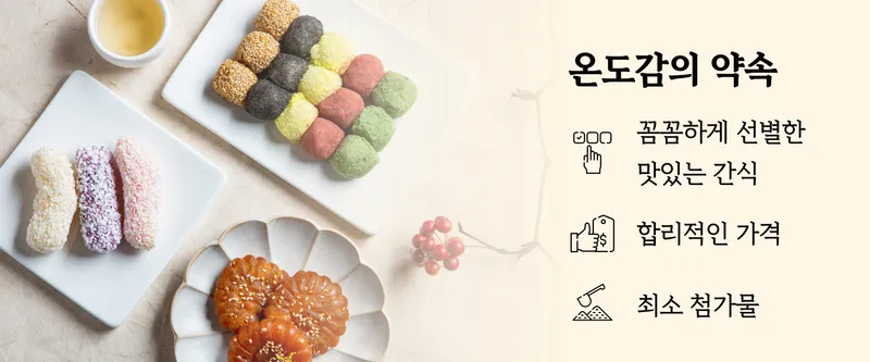온 가족이 즐기는 전국팔도의 맛있는 간식, 온도감입니다. 온도감은 온가족이 공감하며 먹을 수 있는 간식을 꼼꼼하게 엄선하여 보내드리는 팔도감의 브랜드입니다. 온 세대가 함께 즐길 수 있는 맛있는 간식으로 즐겨움을 누려보세요!