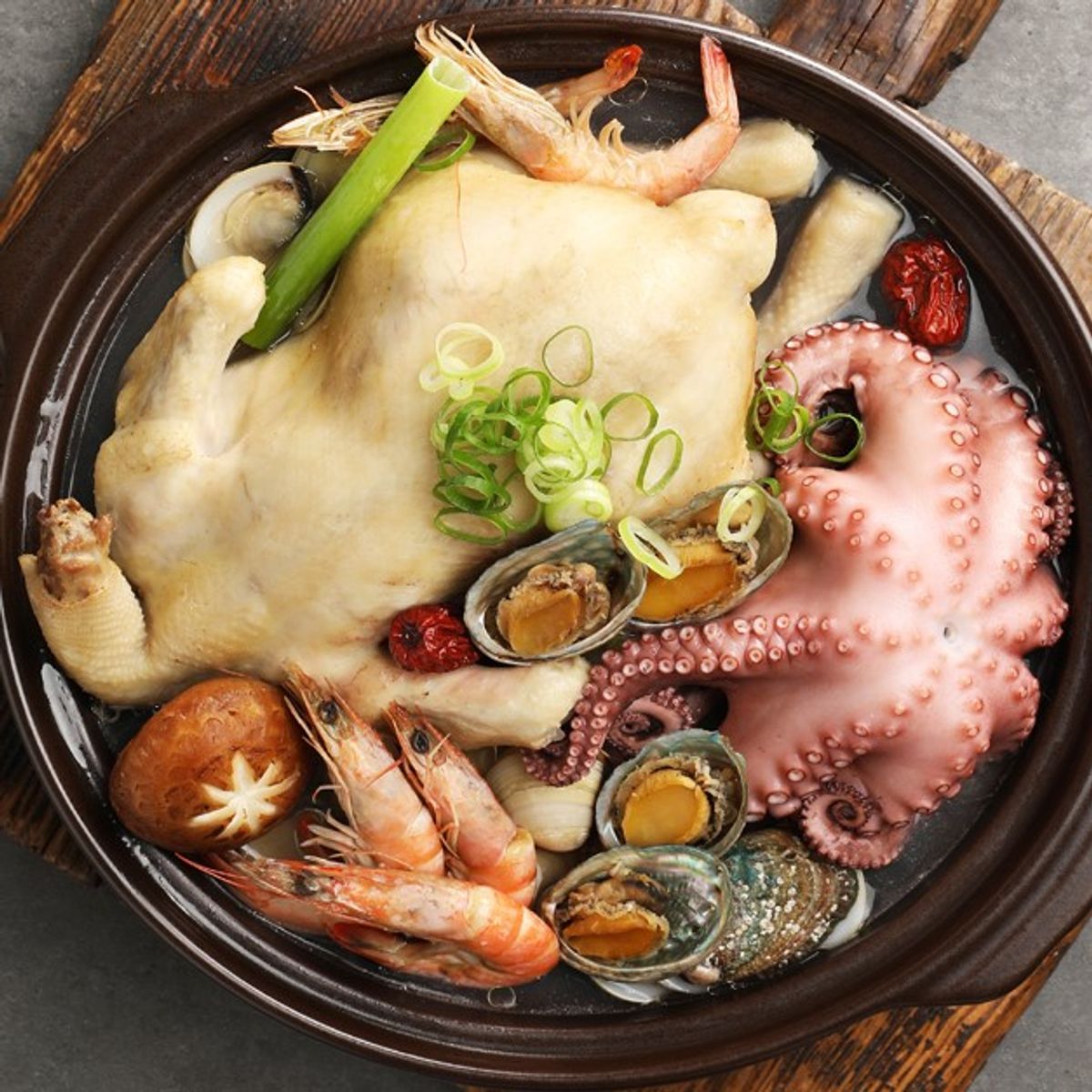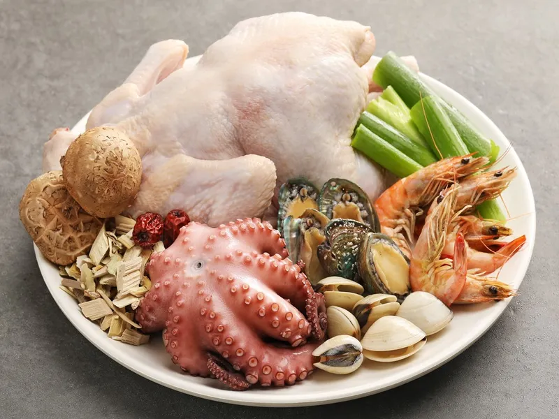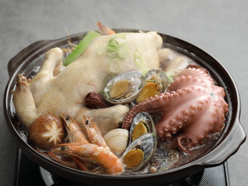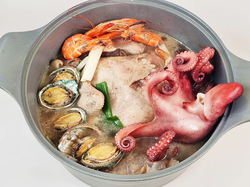 국내산 닭고기를 사용해 질기지 않고 부드러운 식감을 느껴보실 수 있어요. 잡내도 나지 않고 윤기가 좌르르해 그 맛이 아주 좋습니다. 살이 가득 오른 통통한 문어와 전복의 쫄깃함과 함께 하시면 즐거움이 두 배예요!