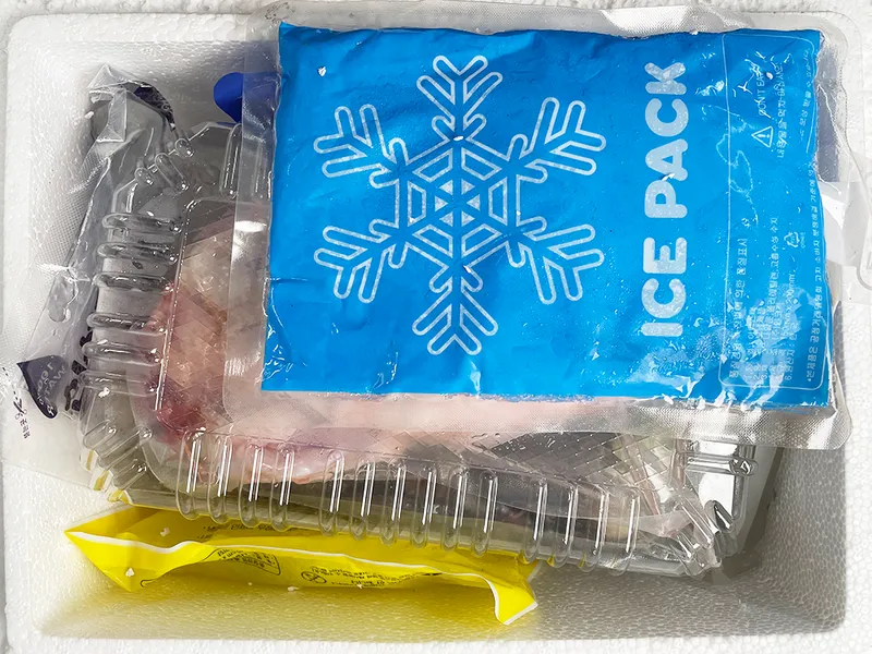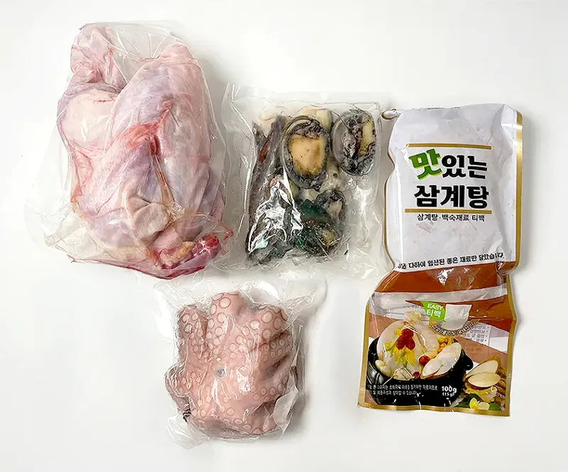상품은 냉동 상태로 개별포장하여 보내드립니다. 아이스박스에 아이스팩을 동봉해 드립니다. 1팩에는 국내산 닭 11호 1kg, 완도산 전복&새우&조개 250g, 문어 300g, 백숙 재료 티 100g이 들어있습니다.