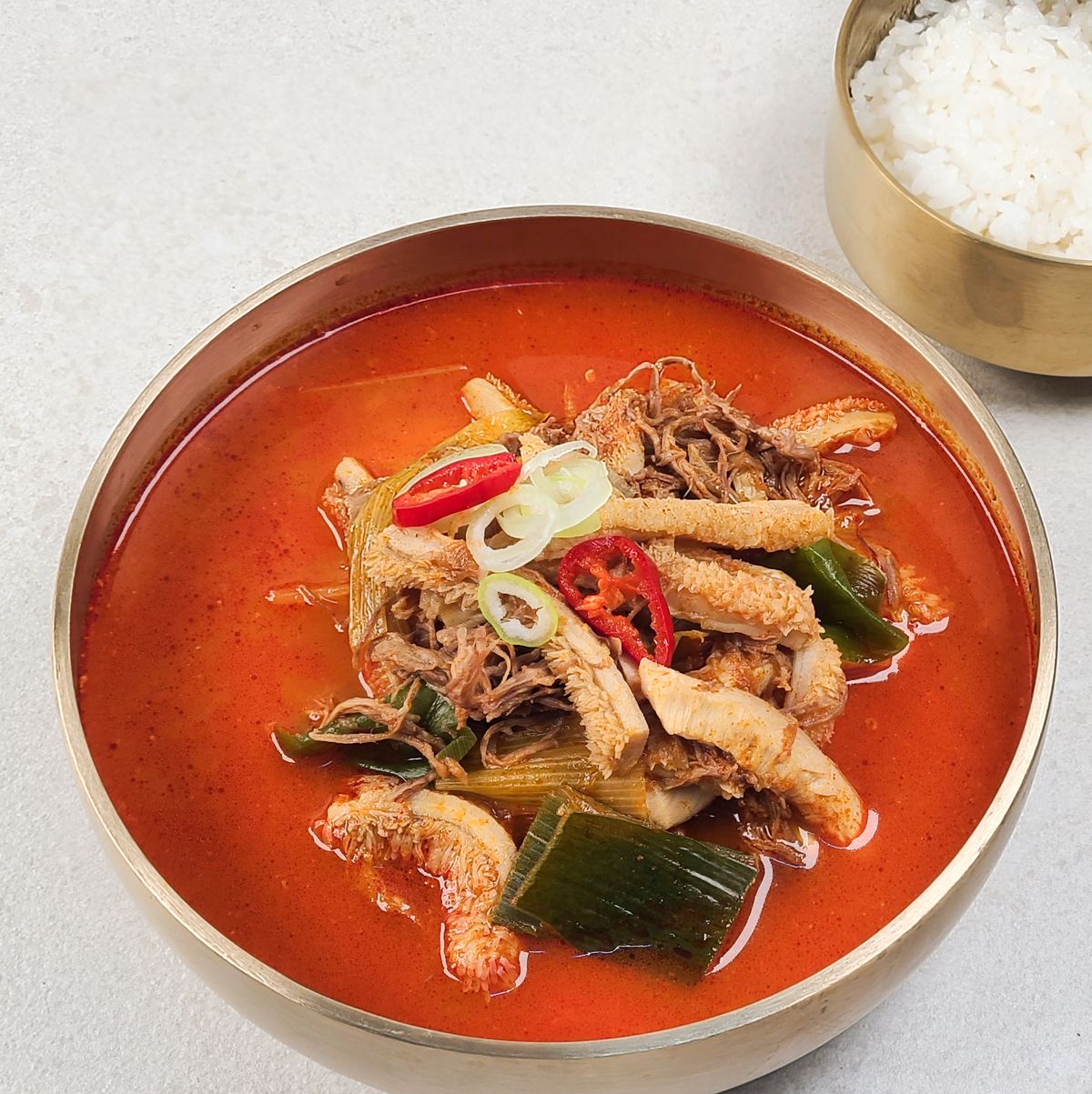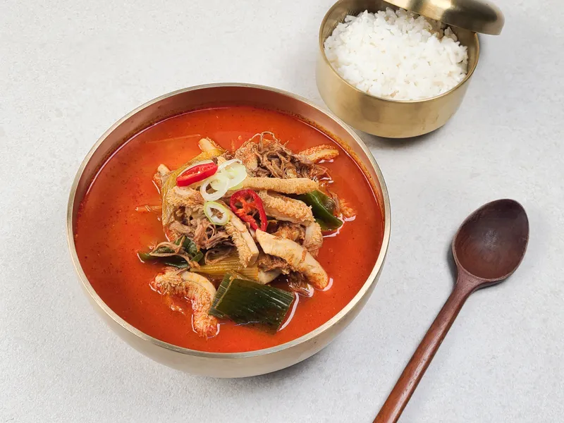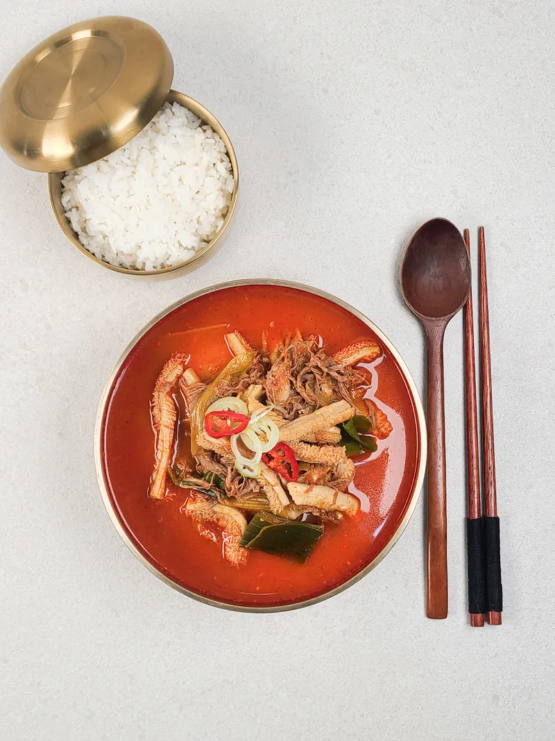 얼큰한 국물과 깐양, 부드러운 소고기가 푸짐하게 들어 있어요. 덕분에 시원하게 속을 풀어주는 해장용으로도, 든든한 한 끼 식사로도 잘 어울려요. 진하게 우려낸 국물 한 숟갈에 감칠맛과 얼큰함이 입안 가득 퍼지며, 술자리 다음 날 시원한 해장이나, 든든한 보양식이 필요할 때 제격이에요.