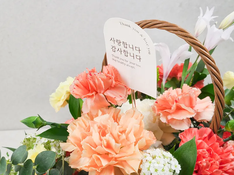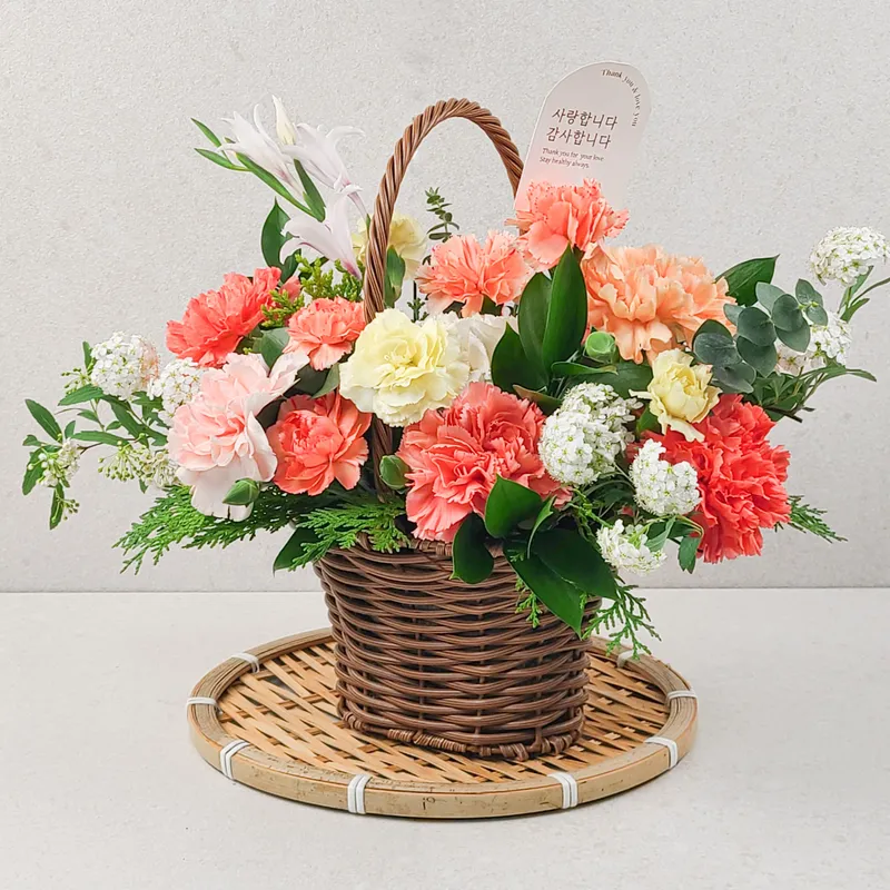 오렌지 카네이션, 연피치 카네이션, 연노랑 카네이션, 연오렌지 카네이션, 스프레이 카네이션(오렌지, 옐로우), 조팝, 미니 글라디올라스, 루스커스, 편백, 유칼립투스로 구성된 핑크 카네이션 꽃바구니입니다. *마음을 전달할 수 있는 감사픽까지 꽂아 보내드립니다.