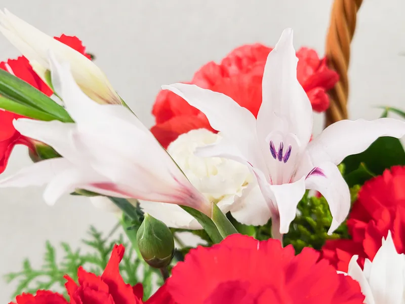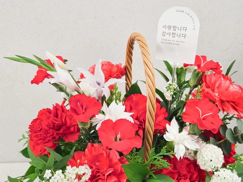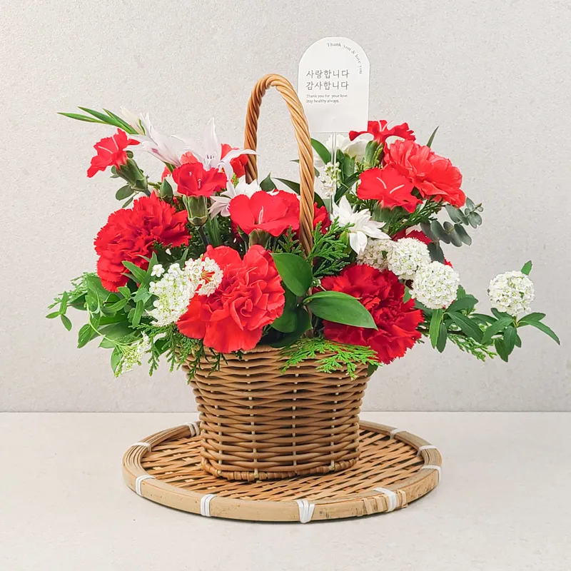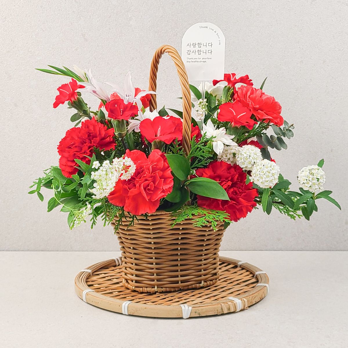 레드 카네이션, 스프레이 카네이션(레드, 화이트), 조팝, 미니 글라디올라스, 루스커스, 편백, 유칼립투스로 구성된 레드 카네이션 꽃바구니입니다. *마음을 전달할 수 있는 감사픽까지 꽂아 보내드립니다.