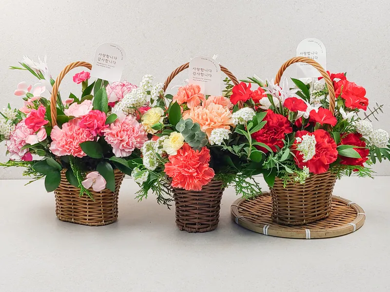 소중한 마음을 담아 전하는 어버이날 카네이션 꽃바구니 3종입니다. 레드, 코랄, 핑크 세 가지 색상으로 풍성하게 구성했어요. 부모님의 취향에 맞게 선택해 사랑과 존경의 마음을 전해 보세요😊