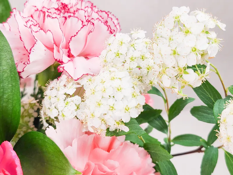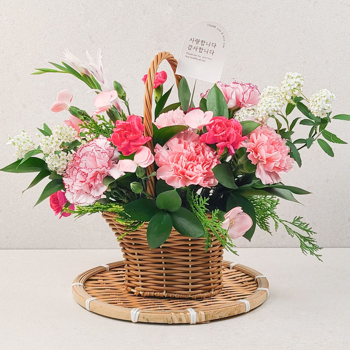 연핑크 카네이션, 마리포사 카네이션, 스프레이 카네이션(연핑크, 진핑크), 조팝, 미니 글라디올라스, 루스커스, 편백, 유칼립투스로 구성된 핑크 카네이션 꽃바구니입니다. *마음을 전달할 수 있는 감사픽까지 꽂아 보내드립니다.