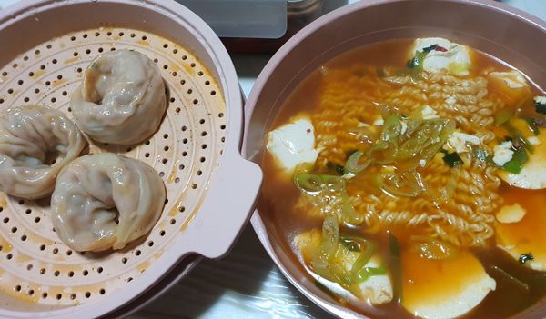 받자마자 다른 재료가 없어서 순두부 라면과 만두찜을