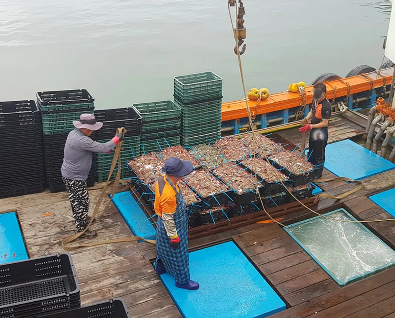 밤 새워 조업한 꽃게는 새벽 5-7시 사이 꽃게 운반 어선을 통해 신진도항으로 입항합니다. 입항 즉시 3시간 내로 선별과 포장 작업을 끝내고 팔도이웃님들께 바로 보내드립니다!